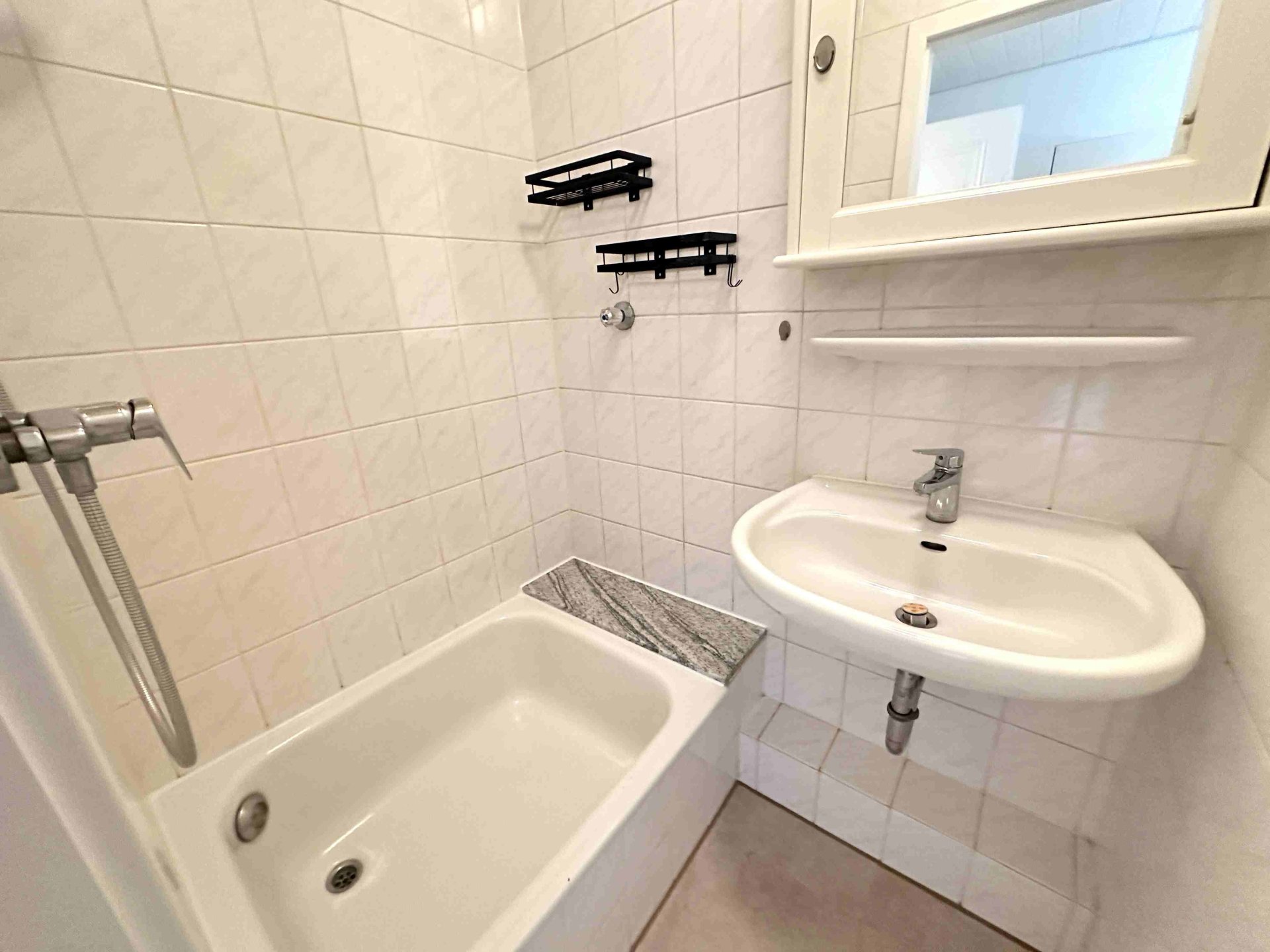Diele, separates WC, Badezimmer mit Dusche, Küche mit Einbauküche, Wohnzimmer und Schlafzimmer.