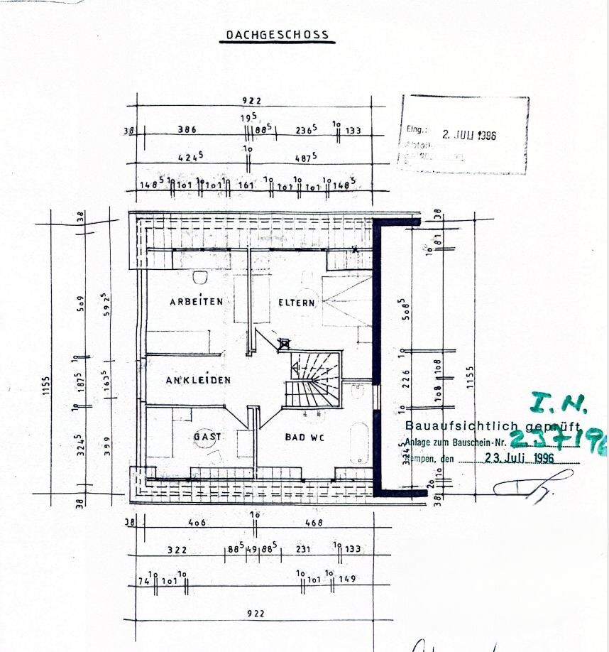 Dachgeschoss: Diele, Badezimmer mit Wanne, Dusche und Tageslicht, Elternschlafzimmer und zwei Kinderzimmer.