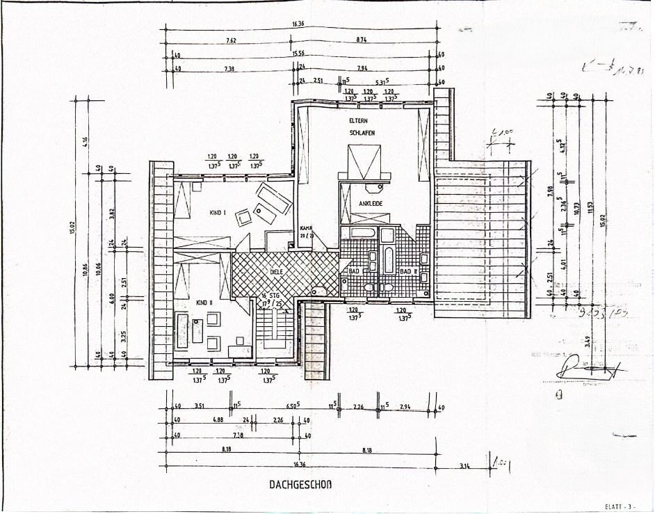 Dachgeschoss: Diele, 2 Kinderzimmer, Kinderbadezimmer mit Dusche und Elternschlafzimmer mit anliegendem Elternbadezimmer mit Wanne und Dusche (beide Bäder mit Tageslicht).