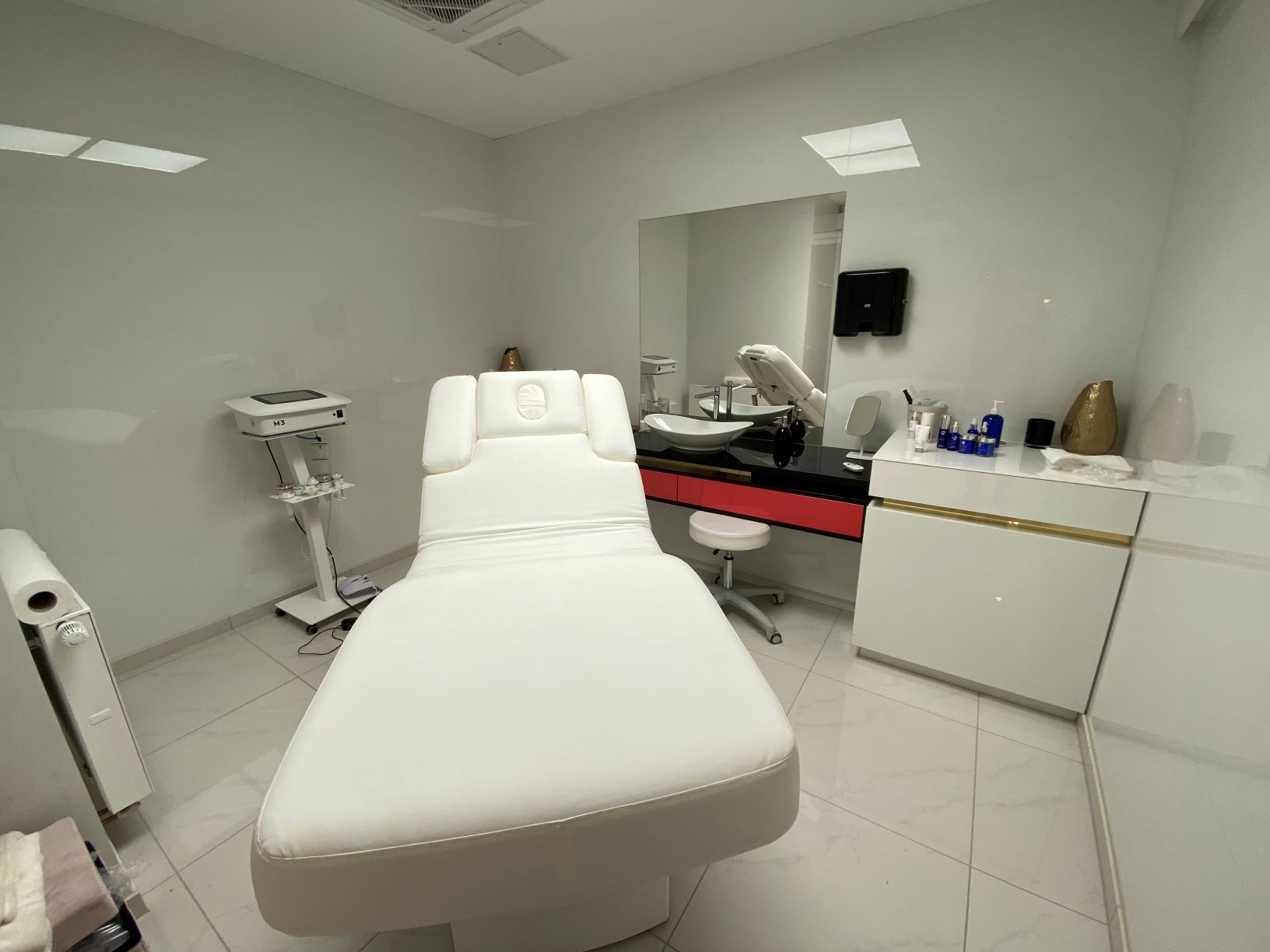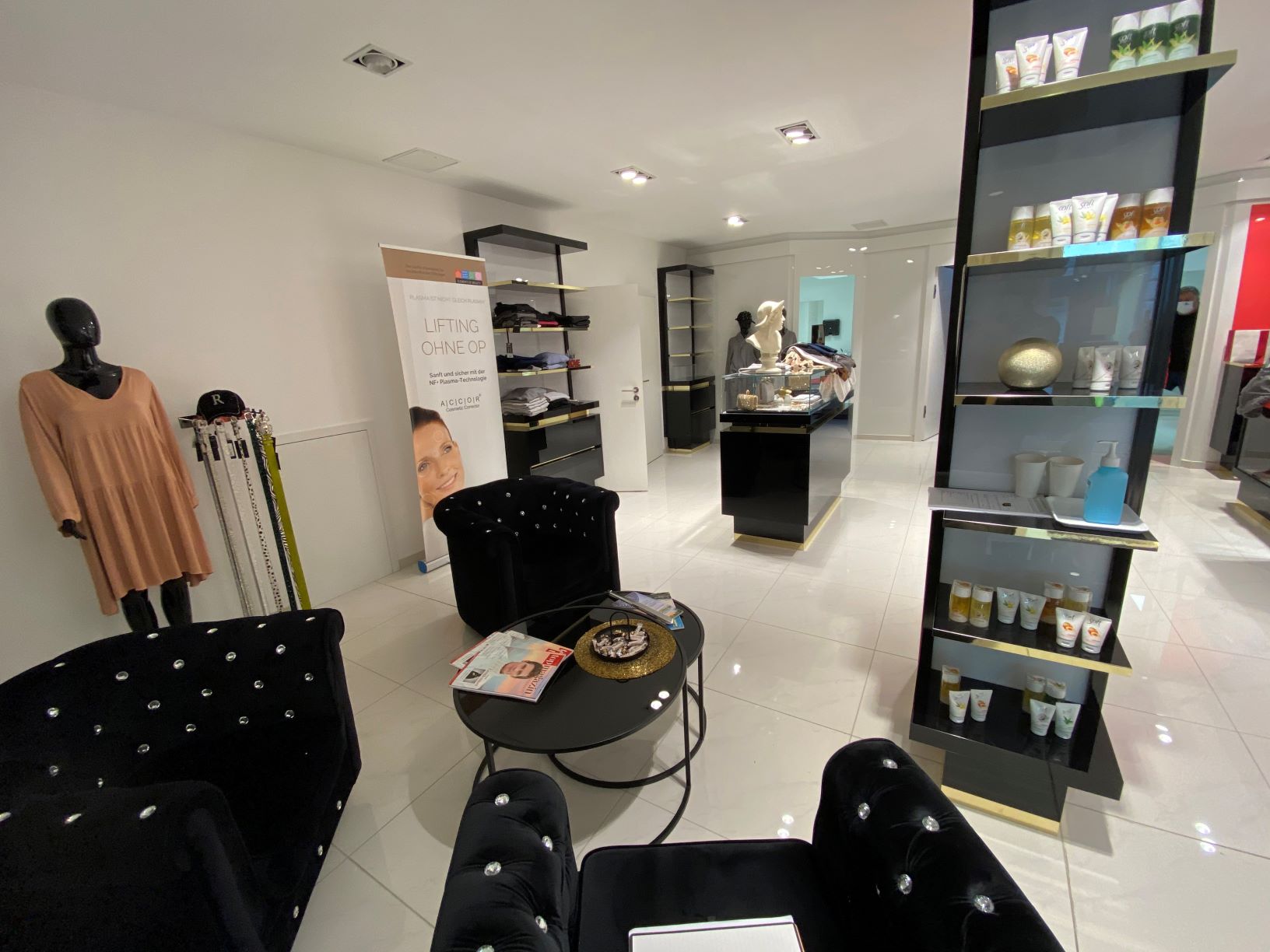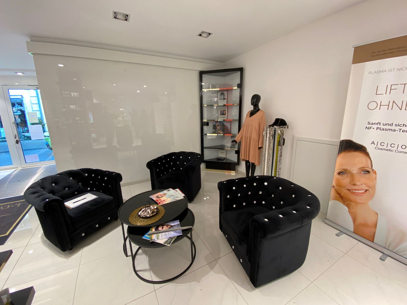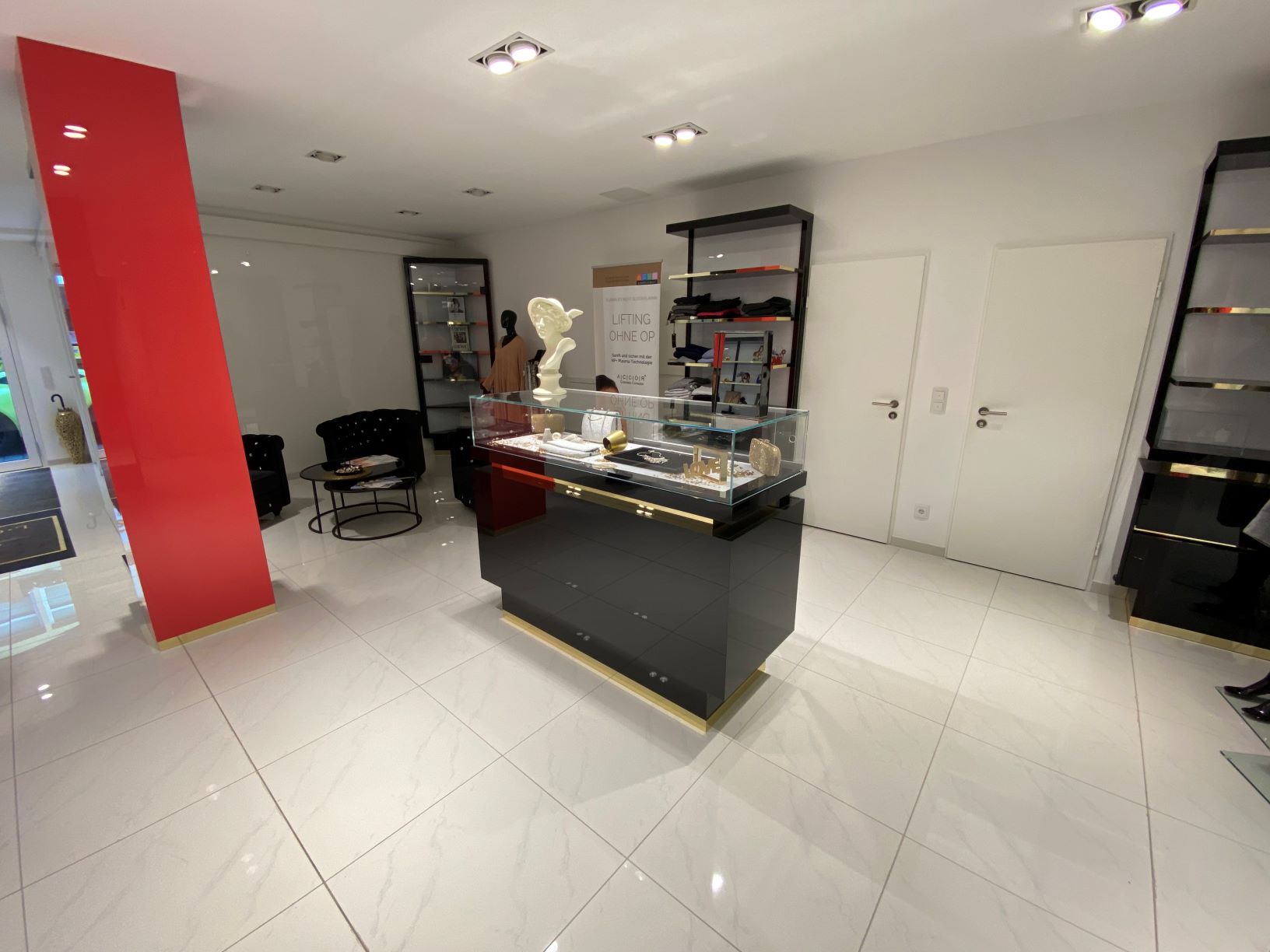 Das Objekt verfügt derzeit über eine neuwertige, luxuriöse Ausstattung. Hierzu zählen z.B. ein hochwertiger Fliesenboden in Carrara Marmoroptik, hochwertige sanitäre Einrichtungen, eine hochwertige Klimananlage sowie ein erstklassiges Beleuchtungskonzept mit in der Decke eingelassenen Spots. Gewisse Einbauten/Technik kann gegen Zahlung einer Abstandssumme von der Vormieterin übernommen werden.