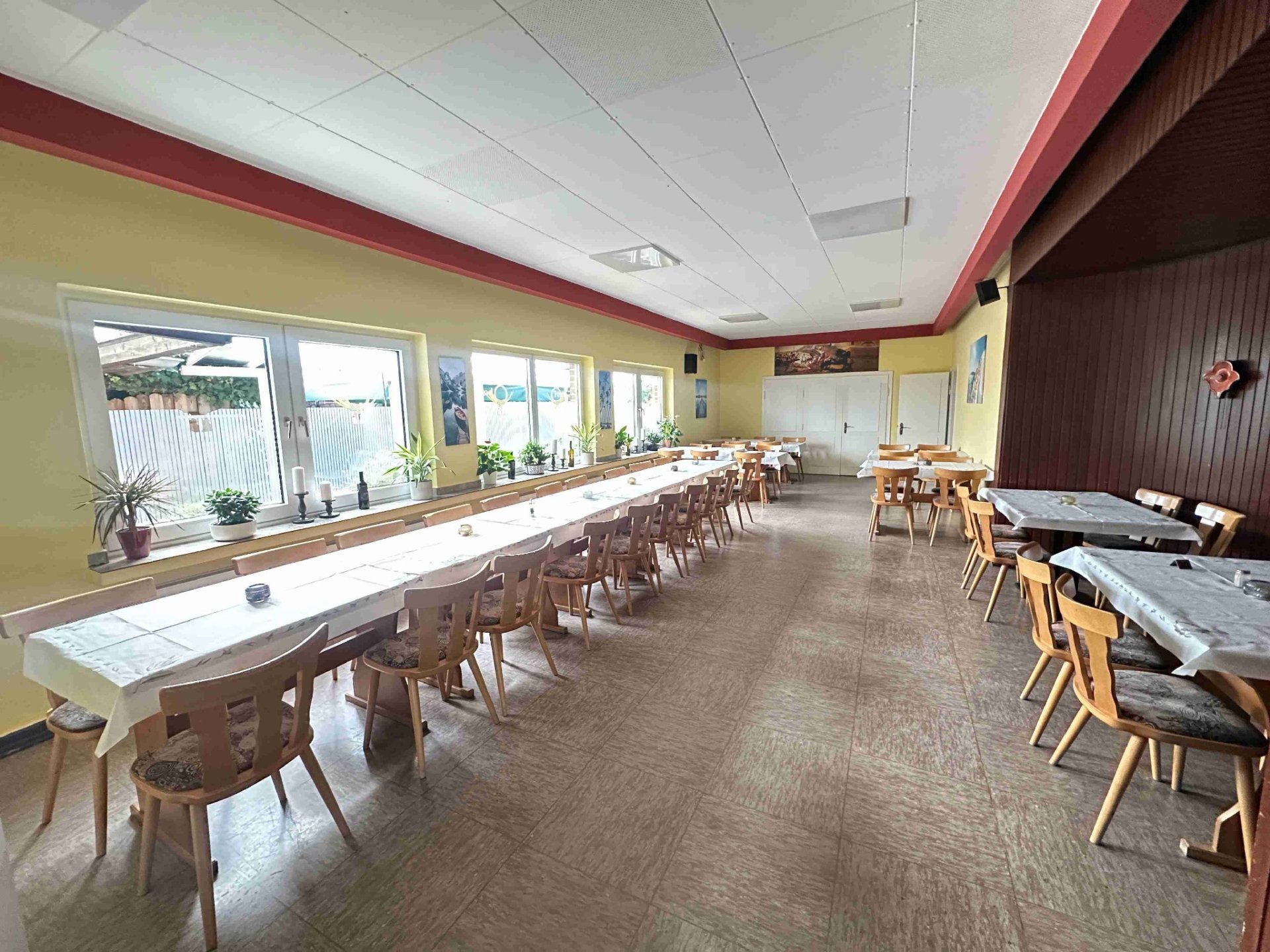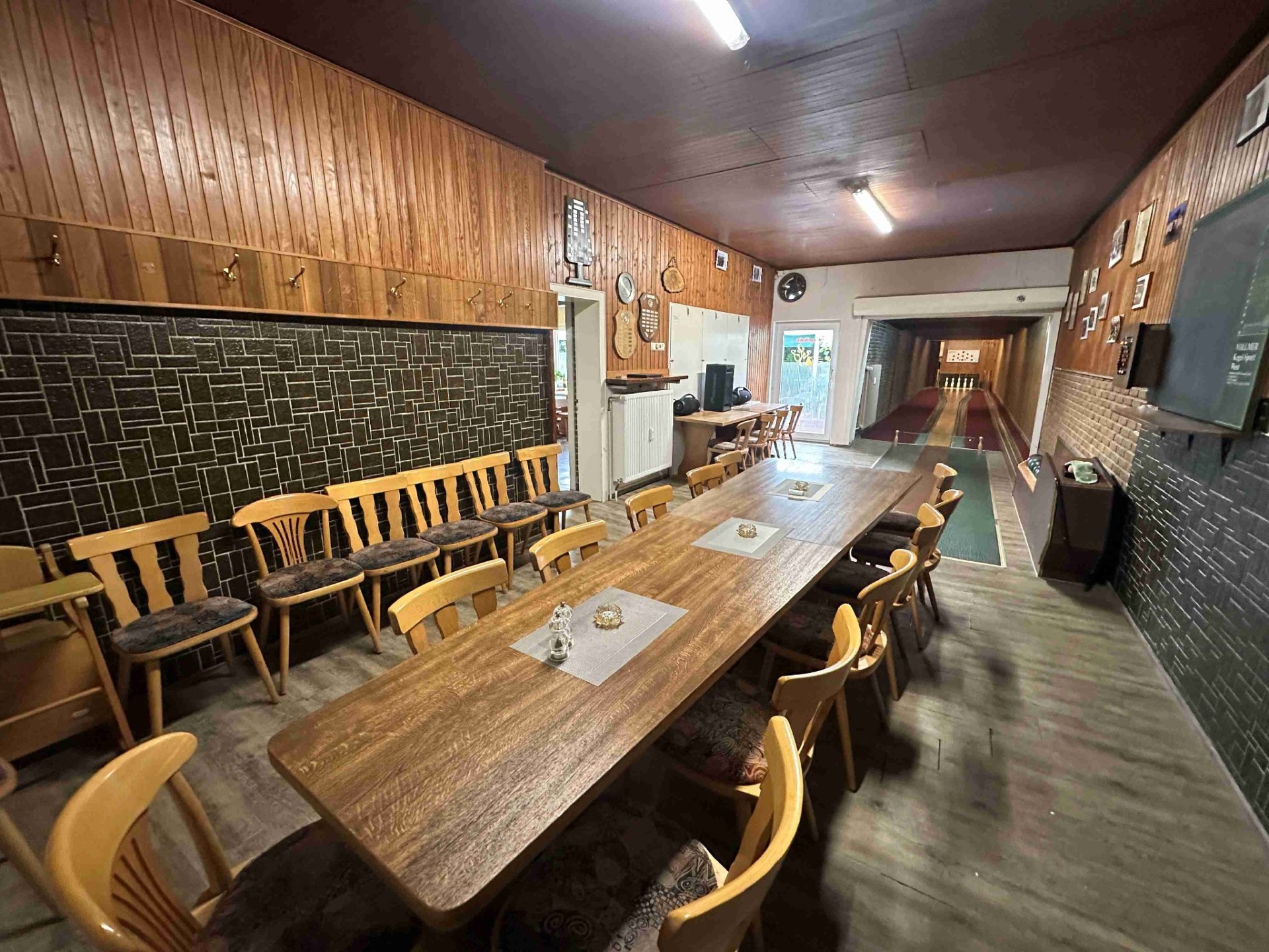 Erdgeschoss: Großer Gastraum für ca. 60 Personen mit Tresen, Küche mit Kühlhaus, Innenhof mit Platz für ca. 40 Personen (teilweise überdacht), Festsaal für ca. 60 Personen, Kegelbahn mit Zugang zum Innenhof.