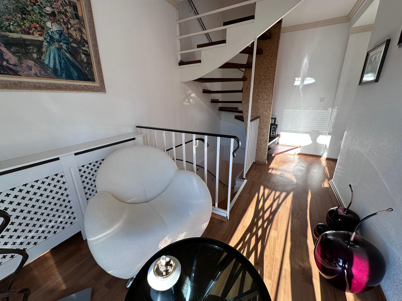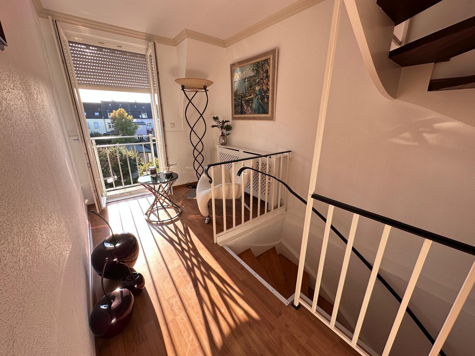 Die Wohnung ist im 2. Obergeschoß und Dachgeschoß eines gepflegten 3-Familienhauses gelegen. Im 2. OG befinden sich die Küche, das große Wohn-/Esszimmer sowie das Badezimmer mit Wanne. Durch eine hochwertige Glastrennwand kann diese auch als Dusche genutzt werden. Die Diele bietet mit einem französischen Balkon einen schönen Sitzbereich Richtung Westen, an dem man den Sonnenuntergang genießen kann. Alternativ kann dieser Bereich auch als Homeoffice genutzt werden. Im Dachgeschoß befindet sich das Schlafzimmer mit Einbauschrank nebst einem begehbaren Kleiderschrank. Weiterhin befindet sich dort ein abgetrennter Abstellbereich. Im Keller des Objektes ist die Waschküche gelegen.
