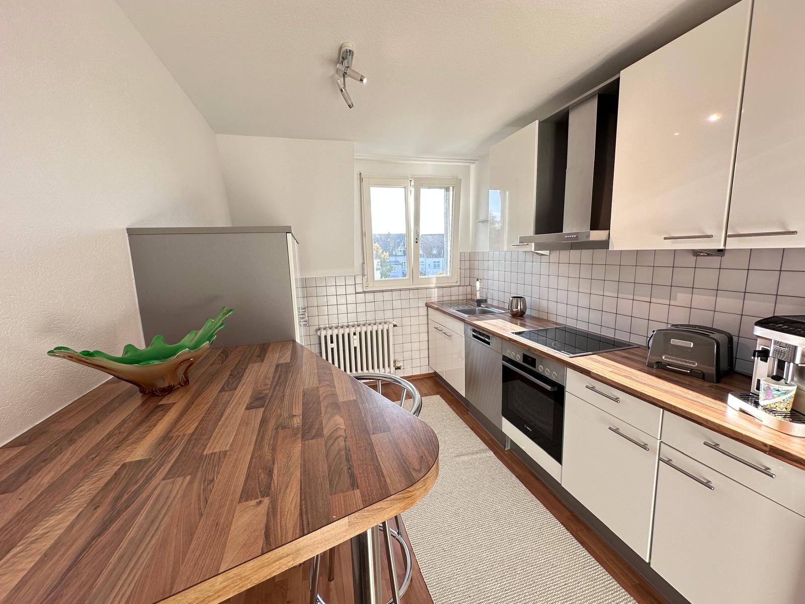 Zur Wohnung gehört eine moderne Einbauküche, deren Nutzung im Mietpreis bereits enthalten ist. Die Elektrogeräte wurden gerade neu ausgetauscht. Die Wohnung ist mit einem Laminatboden sowie hochwertigen Zimmertüren nebst Türbeschlägen ausgestattet. Die Fenster sind mit elektrischen Rolladen versehen. Insgesamt erfüllt die Wohnung gehobene Ansprüche. Das hochwertige und neuwertige Ledersofa im Wohnzimmer kann nicht durch das Treppenhaus abtransportiert werden und sollte deshalb vom Nachmieter gegen eine Abstandssumme übernommen werden. Details hierzu besprechen wir gerne in einem persönlichen Gespräch.
